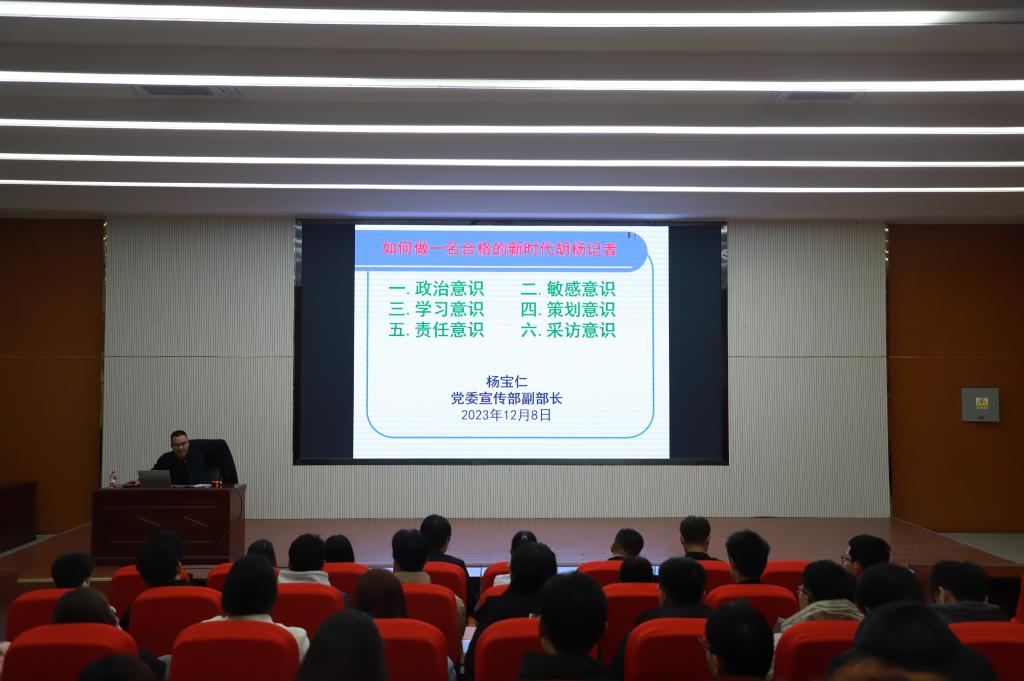 为学院学生宣传工作平稳、有序开展,提高学院学生宣传骨干的新闻写作能力,我院团委于12月8日晚在文科实验楼开展了学生新闻宣传专题培训。此次培训邀请了学校党委宣传部副部长杨宝仁老师向学院青年马克思主义培训班学员、院团委宣传部成员以及各班宣传委员作“如何做一名合格的新时代胡杨新闻工作者”专题培训。