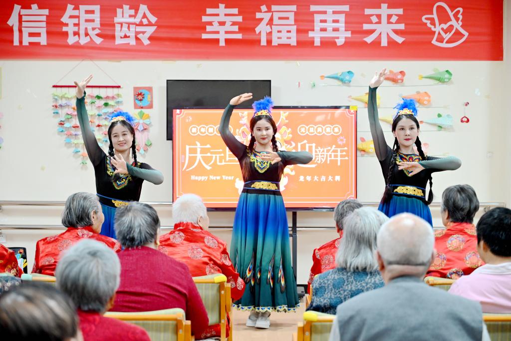 “我想说其实你很好,你自己却不知道...”一首《暖暖》拉开了表演的帷幕。小品《四大才子》用生动形象的表演,将爷爷奶奶们逗得笑逐颜开,整个养老院弥漫着欢声笑语。此外,还有民族舞、诗朗诵《新的一年带来新的希望》等节目。