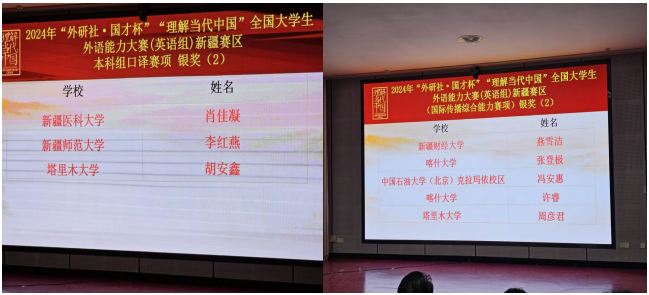 11月3日,2024年“理解当代中国”全国大学生外语能力大赛新疆赛区复赛在新疆科技学院西校区成功落下帷幕。我院物流管理2022级学子周彦君同学;获得国际传播综合能力银奖,物流管理2022级胡安鑫同学获得本科组口译赛项银奖。