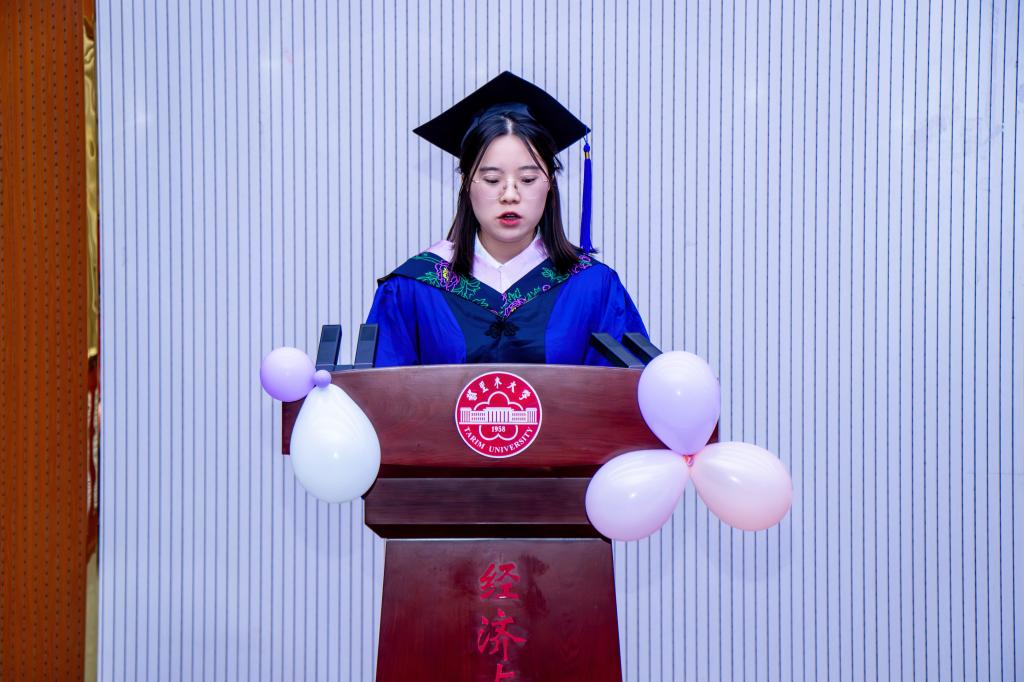 毕业生代表杨传艳回顾了在校园中的学习和成长经历,表示全体毕业生将带着母校的教诲和精神,勇敢面对人生的新挑战,为国家和社会贡献力量。同时祝愿母校和学院未来更加辉煌,并承诺将不负母校的培养,书写属于自己的精彩篇章。