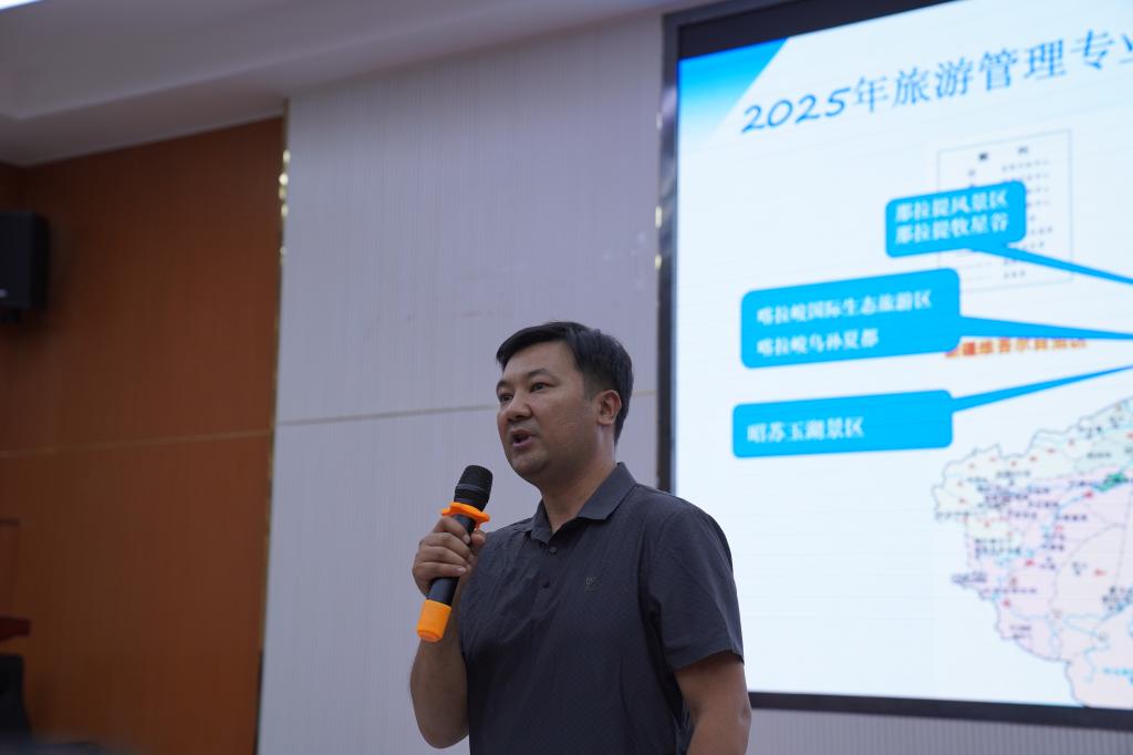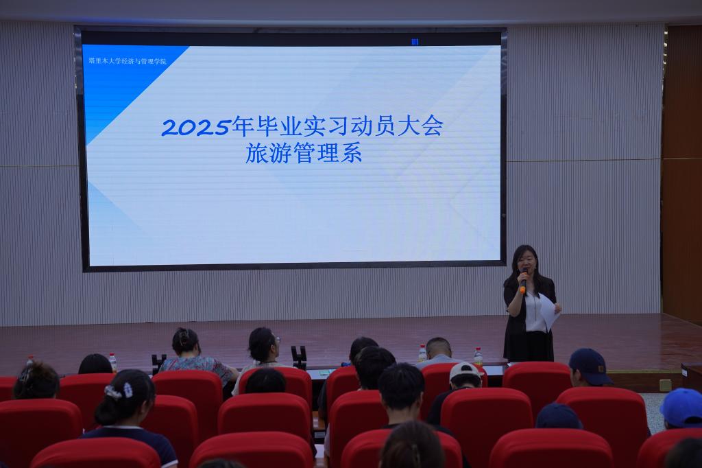 2025年6月10日晚21:00,塔里木大学经济与管理学院旅游管理系,在文科实验楼503报告厅,召开了毕业实习动员大会。本次动员大会召集了旅游管理专业2个年级共94名集中毕业实习的同学参加,会议邀请了旅游管理系相关教师参加,就毕业实习工作进行了安排部署和动员。