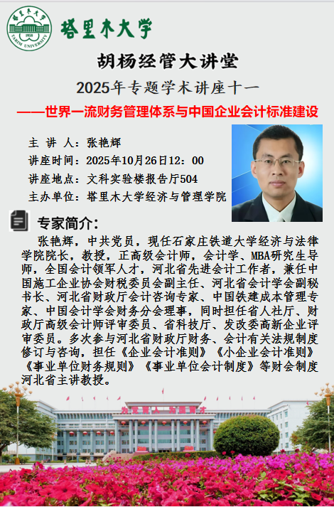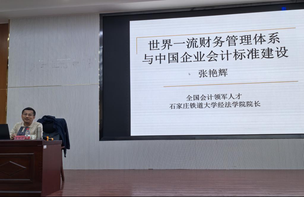 2025年10月26日,石家庄铁道大学经济与法律学院院长张艳辉教授受邀赴塔里木大学,在新文科楼504教室为该校经济与管理学院财务管理与会计系师生,作《世界一流财务管理体系与中国企业会计标准建设》专题讲座,既带来前沿财会理论与实践经验,更精准对接新疆南疆财会专业发展需求,为培养适配区域经济的财会人才指明方向。