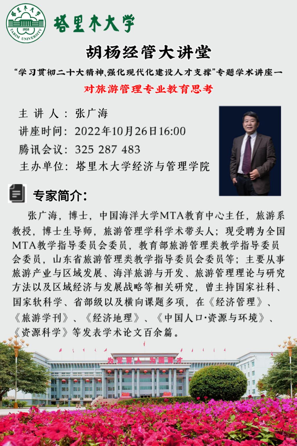 10月26日下午,经济与管理学院“胡杨经管大讲堂”专题学术讲座第一讲隆重开始,以“学习贯彻二十大精神,强化现代化建设人才支撑”为专题,特邀请了全国旅游管理专业学位研究生教育指导委员会委员、中国海洋大学MTA教育中心主任张广海教授,为我院师生作了“对旅游管理专业教育思考”的讲座。此次讲座在线上开展,学院党委委员、副院长晁伟鹏、旅游管理学术带头人贾强及旅游管理专业师生参加了讲座,学院党委副书记、院长王学剑主持。
