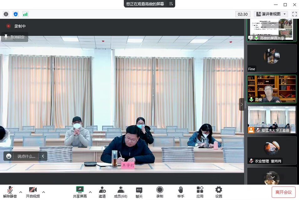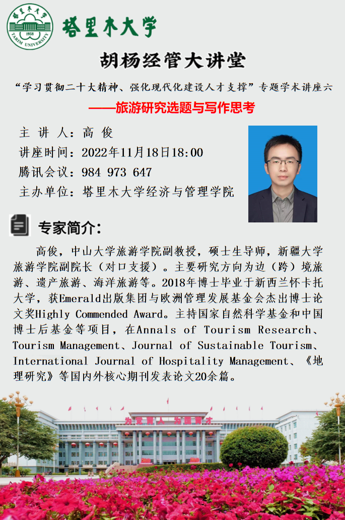 11月18日下午,经济与管理学院“胡杨经管大讲堂”以“学习贯彻二十大精神、强化现代化建设人才支撑”为专题,特邀请中山大学旅游学院副教授、硕士生导师,新疆大学旅游学院副院长(对口支援)高俊,为我院师生作了题为“旅游研究选题与写作思考”的专题学术讲座,此次讲座采用线上+线下的形式开展,旅游管理专业师生及研究生参加了本次讲座,学院党委副书记、院长王学剑主持。