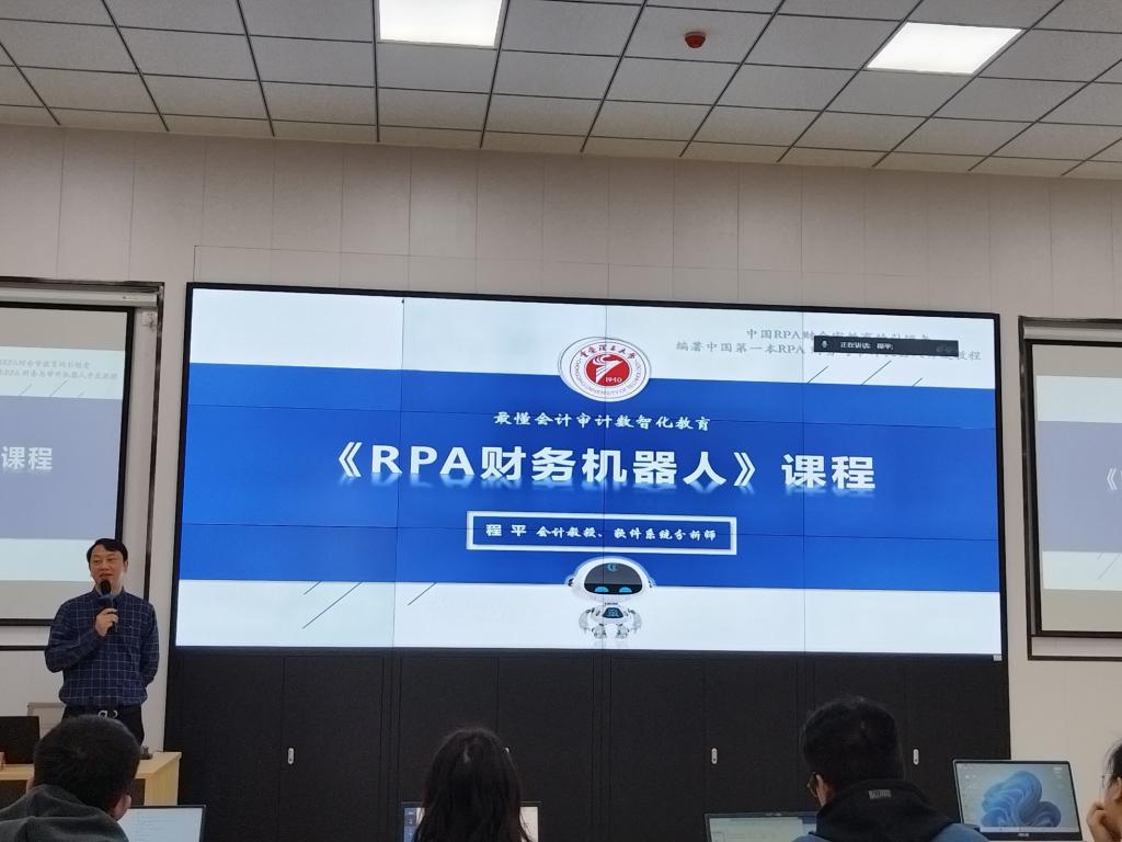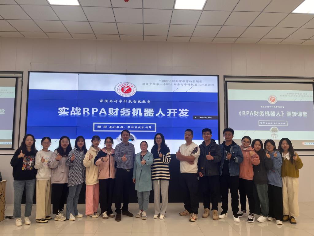 在全球数字化转型浪潮下,为增强学生在数智时代推进高质量发展的思想自觉、政治自觉和行动自觉,紧跟科技革命和产业变革新趋势,优化我院会计学科人才培养目标,2023年10月16日至18日,塔里木大学经济与管理学院邀请博士生导师、中国财政科学研究院会计信息化博士后、重庆理工大学云会计大数据智能研究所所长、中国“云会计”概念的提出者,程平教授,于新文科楼503教室为我院作“RPA财务机器人应用”专题讲座,学院会计专业研究生及财会系全体教师参加。
